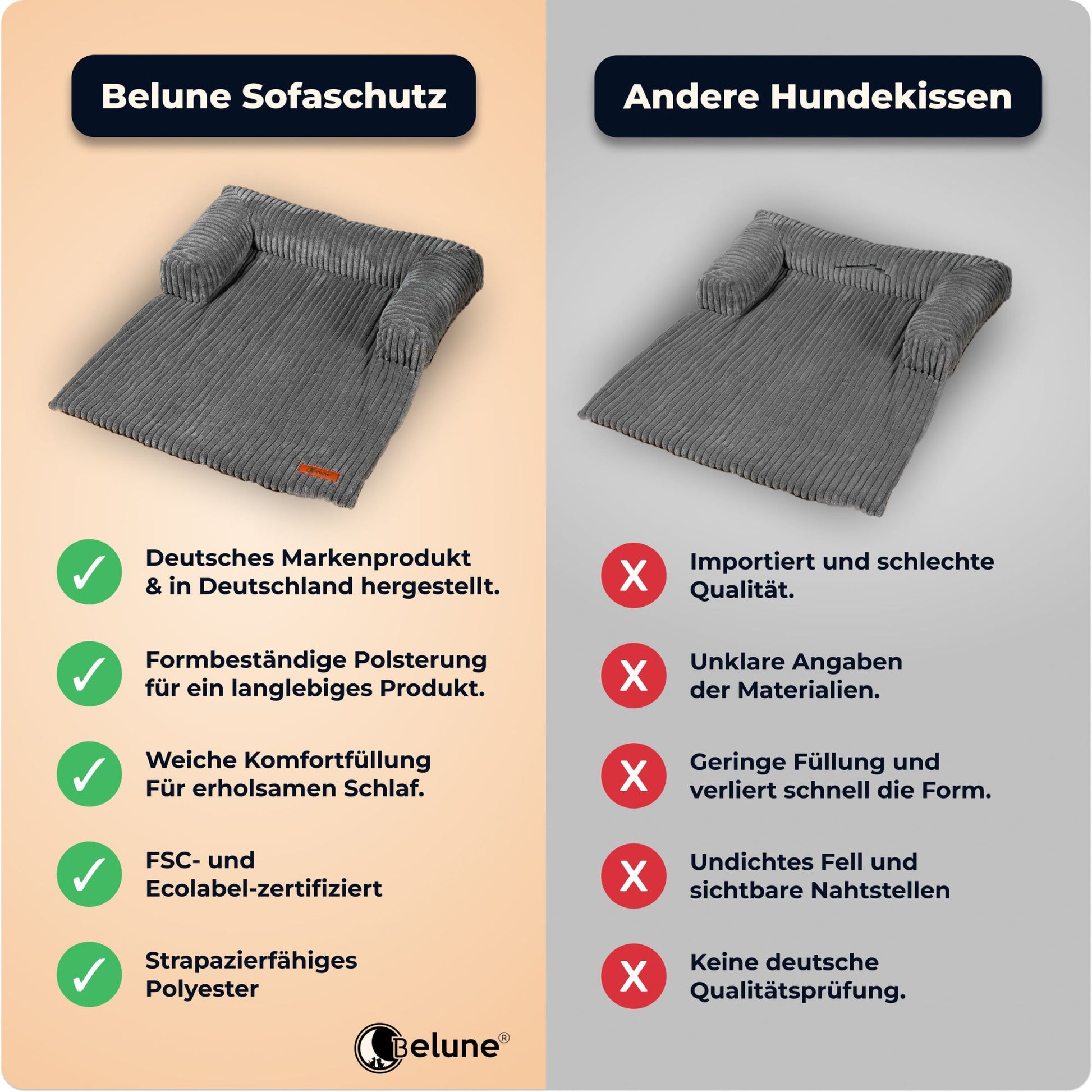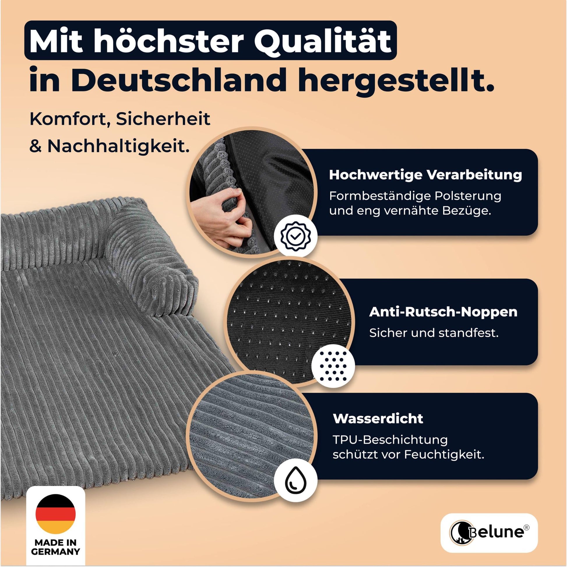 Mit seinem hochwertigen Memory-Foam-Kern und dem weichen, pflegeleichten Bezug bietet das Belune Hundebett deinem Vierbeiner Komfort, den er verdient. Die ergonomische Form passt sich optimal an den Körper an, entlastet Gelenke und Wirbelsäule und sorgt so für tiefen, erholsamen Schlaf. Robust, stilvoll und durchdacht – ein Platz, an dem sich dein Hund rundum geborgen fühlt.